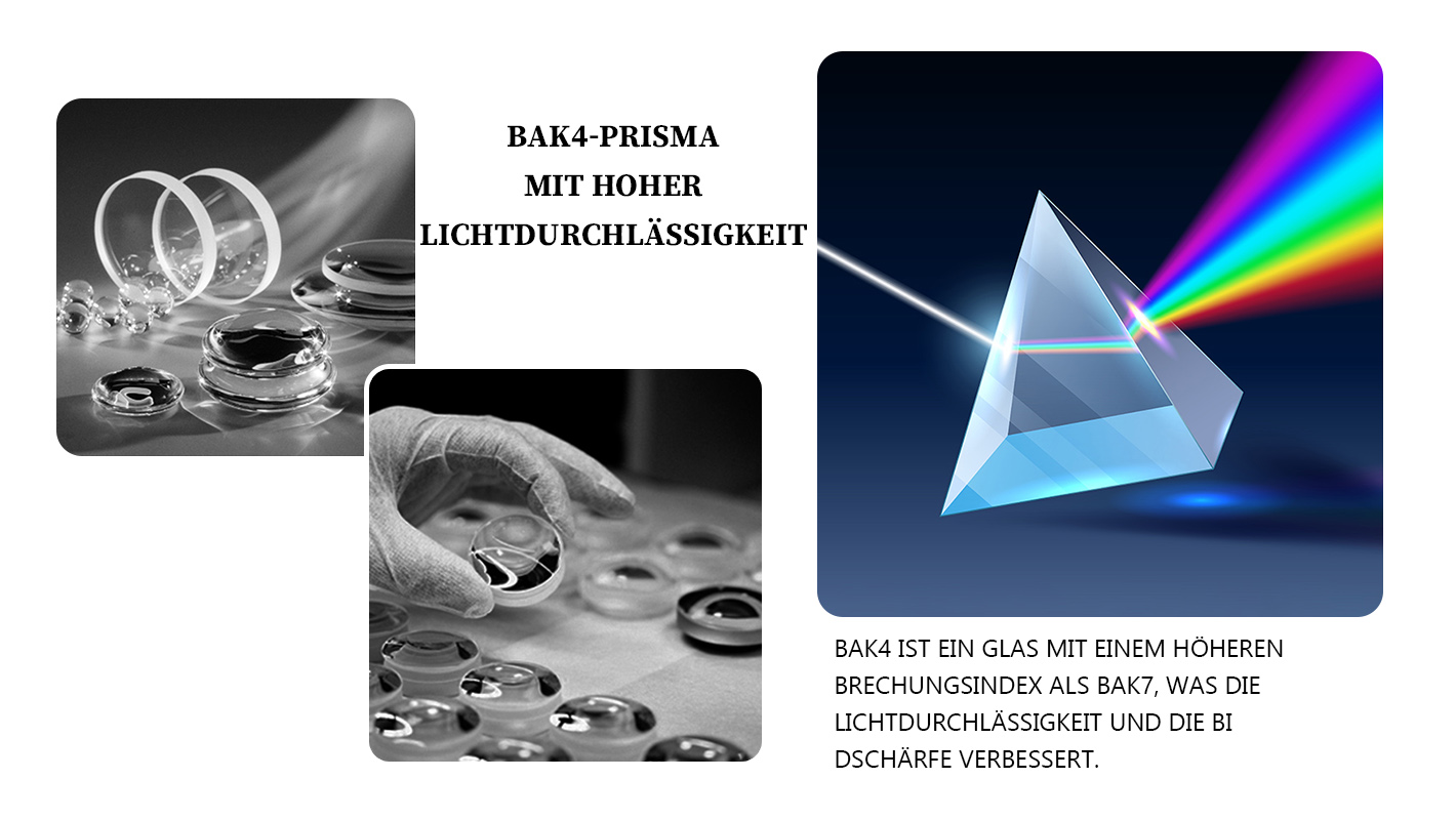 1. BAK4-Prisma mit hoher Lichtdurchlässigkeit. BAK4 hat einen höheren Brechungsindex als BAK7-Glas, was die Lichtdurchlässigkeit effektiv verbessert und für eine klare Abbildung sorgt.